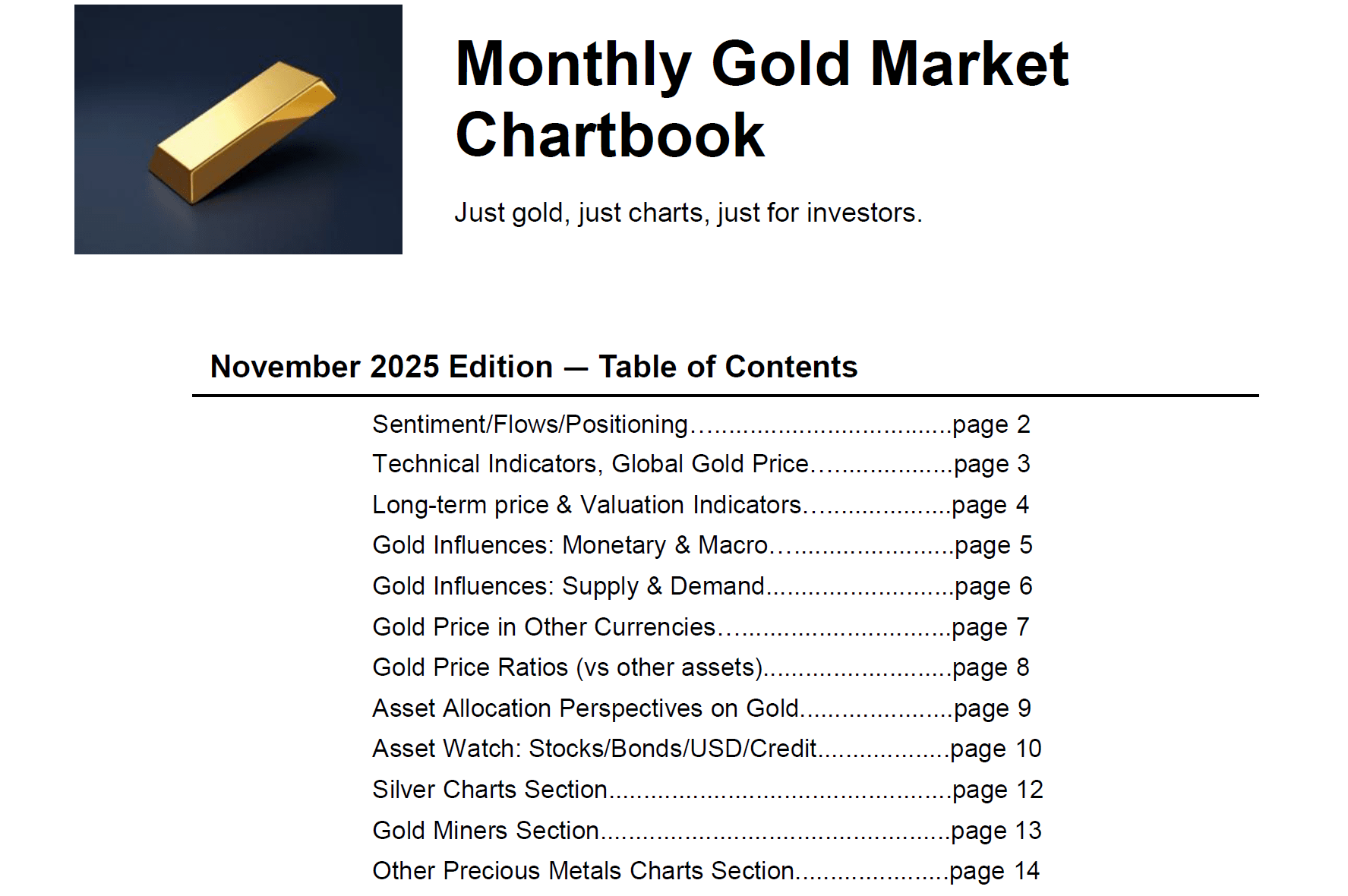 The monthly Gold Market Chartbook is specifically and carefully designed to help busy investors quickly + easily understand the key drivers of risk vs opportunity in the gold market (and how it fits into traditional portfolios). The November edition has just been released!