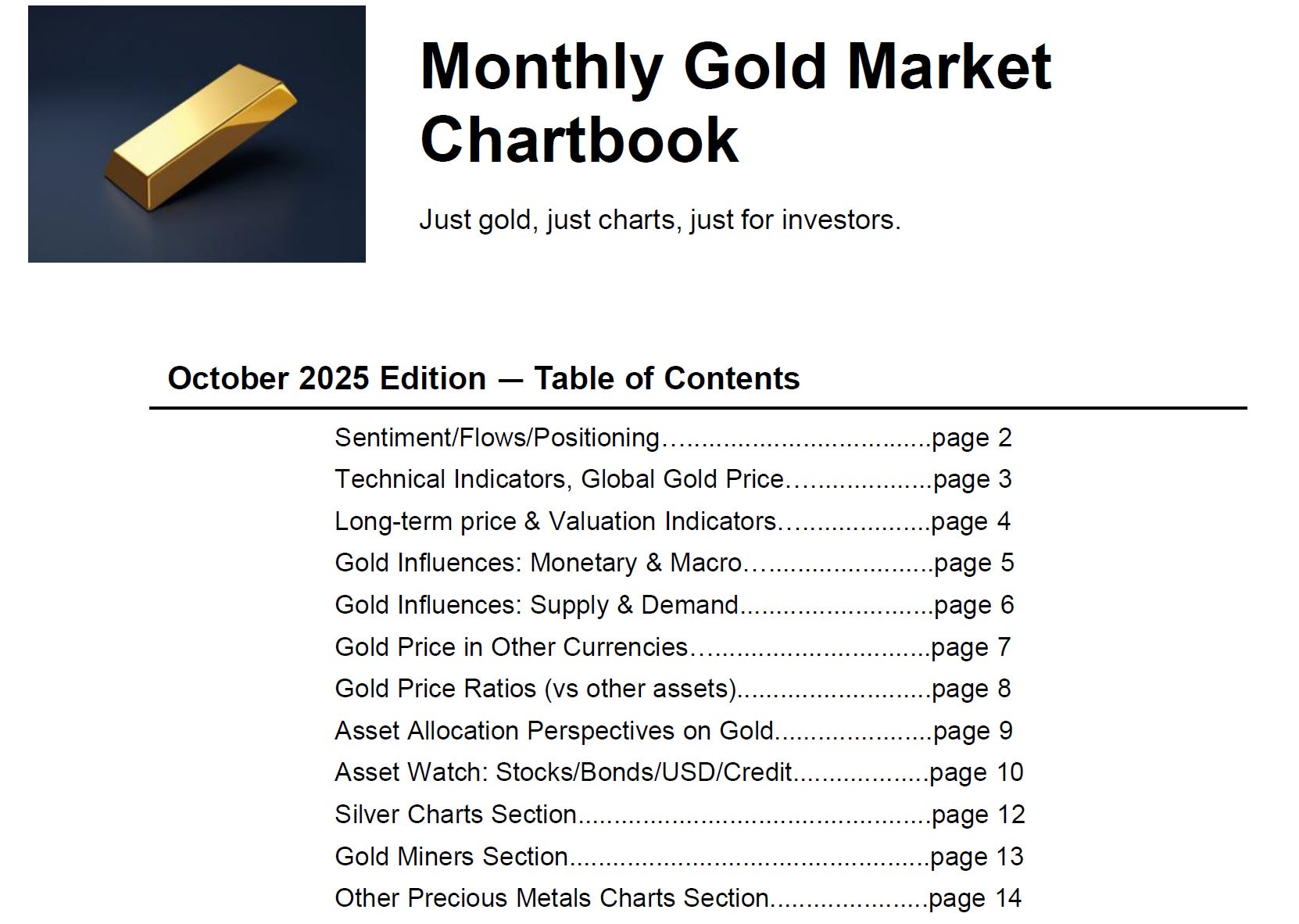 The monthly Gold Market Chartbook is specifically and carefully designed to help busy investors quickly + easily understand the key drivers of risk vs opportunity in the gold market (and how it fits into traditional portfolios). The October edition has just been released!
