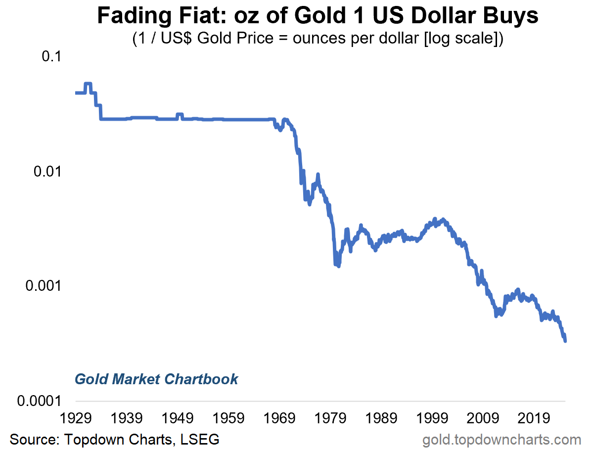 To celebrate the US$ gold price breaking the $3000/oz level, here’s the flipside — the amount of gold in ounces that a single US Dollar can buy.