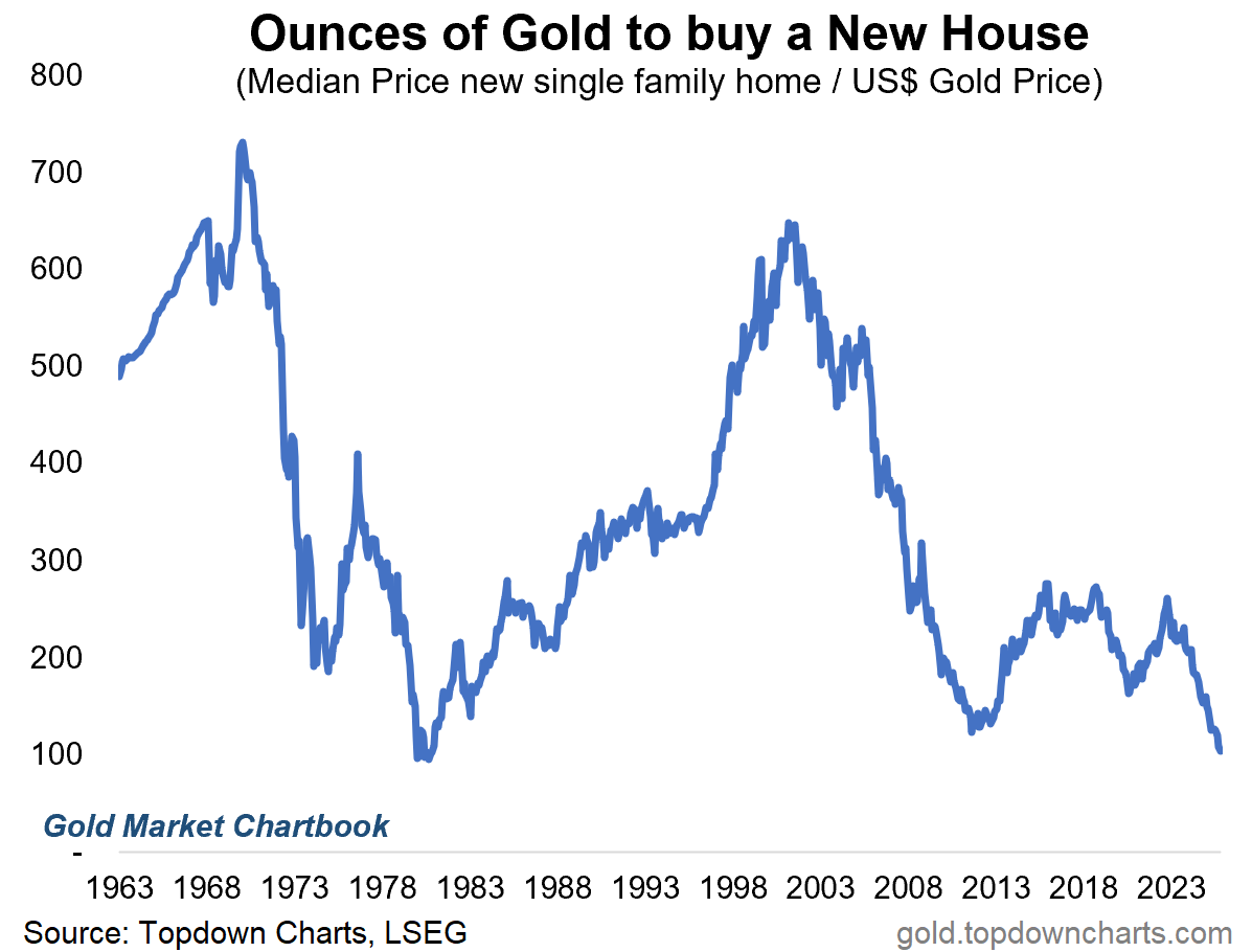Lastly, a bit of fun with charts — the ounces of gold required to buy a new house in the USA is approaching record lows (thanks mostly to soaring gold prices, but also lackluster housing).