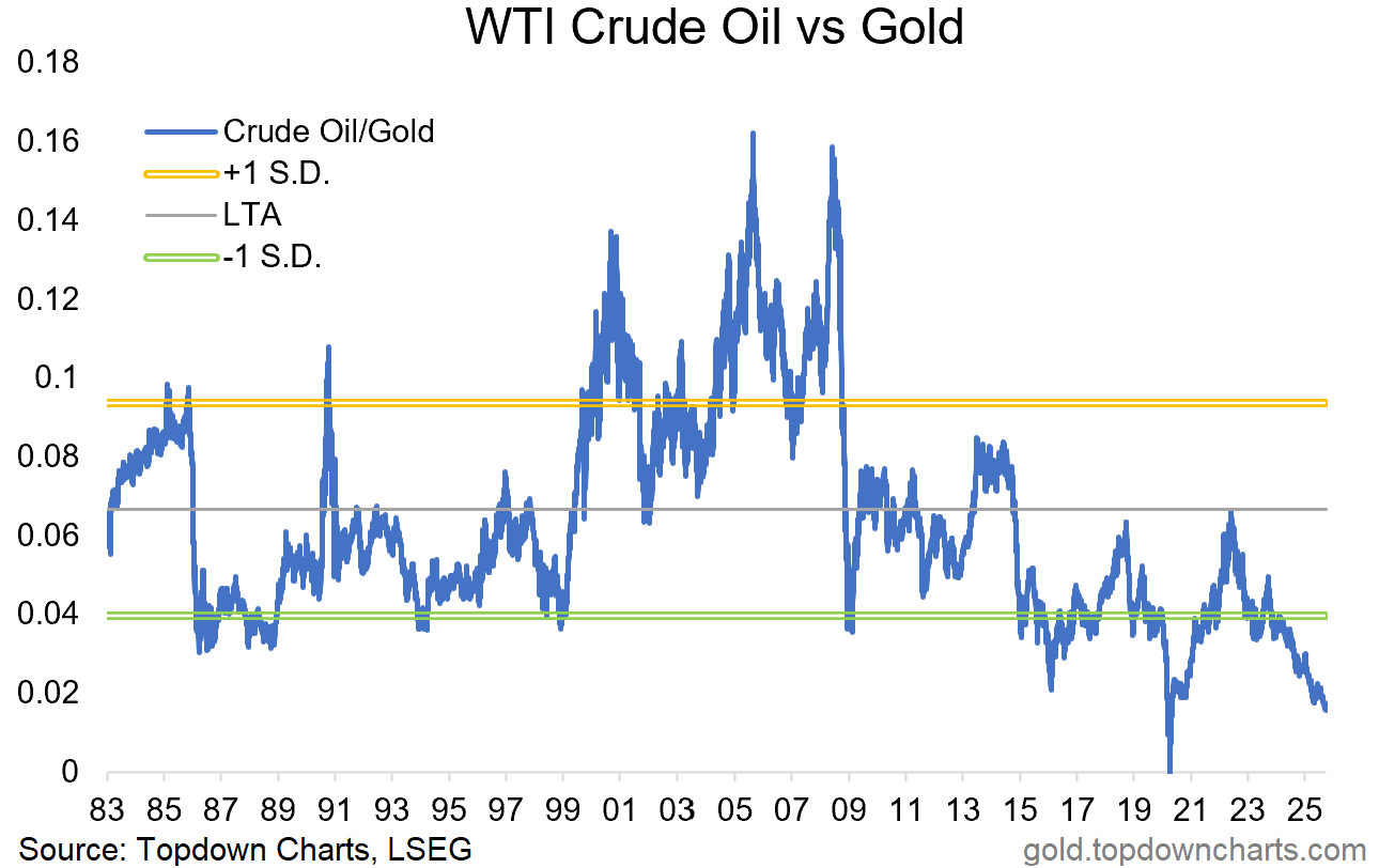 Which brings us to the oil vs gold ratio — which has plunged to its second lowest reading in recent recorded history.
