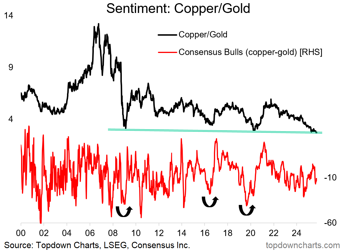 On a similar note, here’s the copper/gold ratio meandering along its long-term major support level. I think odds are good we rally off this level partly from a technical standpoint given the moves in relative sentiment (bullish divergence).