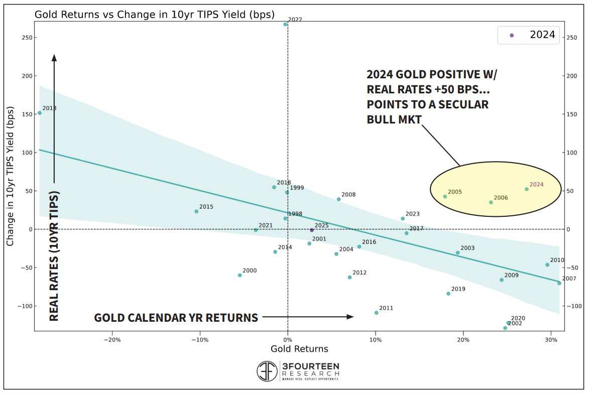 As noted, the past link between gold and TIPS real yields broke down in 2022. Warren Pies of 3Fourteen Research comments: “two broad conclusions: 1) Central banks driving the run, 2) This is secular bull market behavior.“ (source)