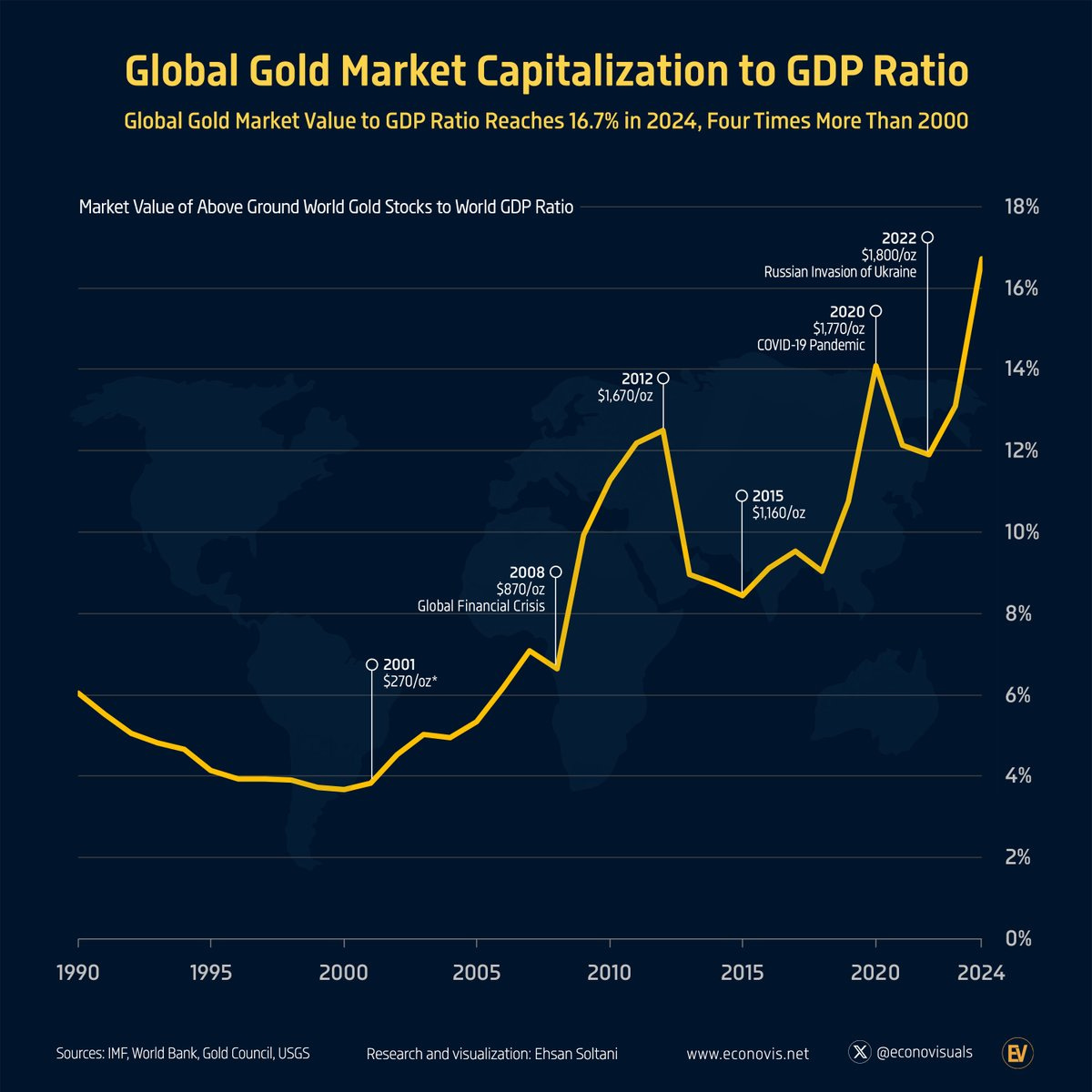 Last but not least, here’s an interesting chart from Econovis showing the path of the Global Gold Market capitalization to GDP ratio. (source)