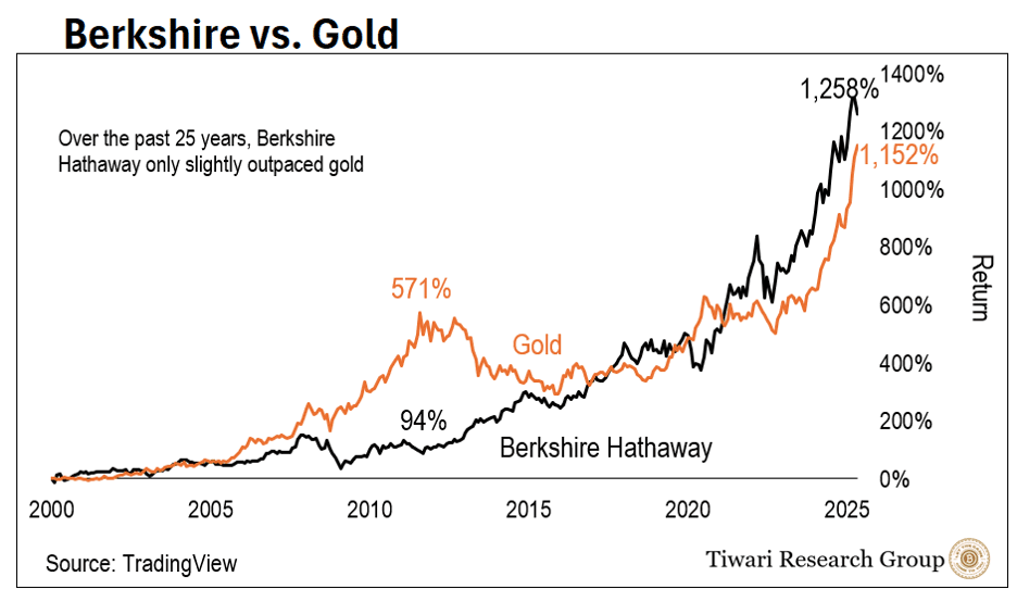 Here’s one perspective: “Buffett is the single-greatest asset allocator in the history of financial markets. Yet when you tally up the score, all Buffett essentially did was match the performance of gold over the past 25 years.“ (source)