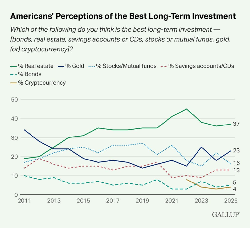 Mining.com reports: “Gold has surpassed equities as the second most popular long-term investment choice amongst Americans, according to the latest poll by Gallup“ (source)