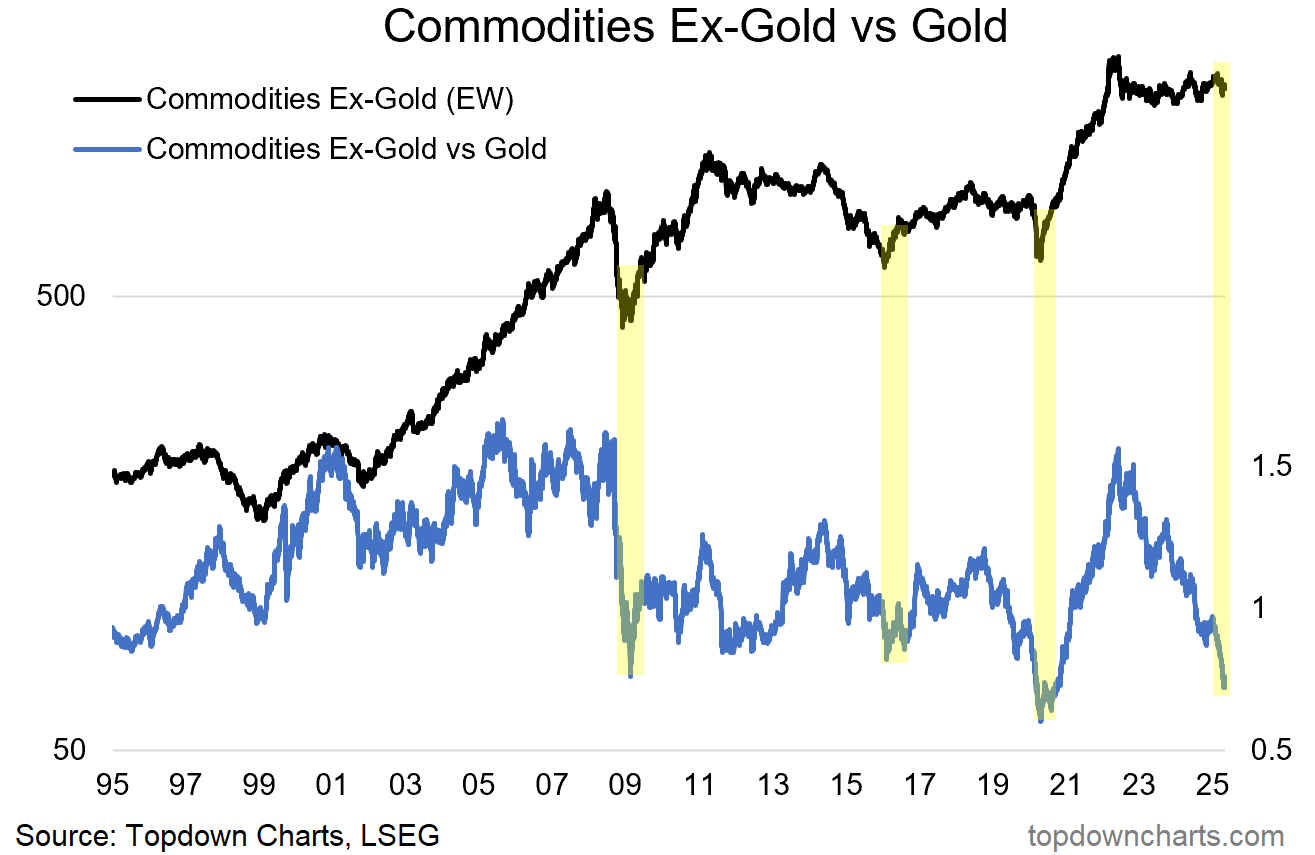 On that note, here’s an old favorite chart of mine — it shows the equal-weighted price index of commodities ex-gold, and the ratio of that index vs the gold price. There seems to be a pattern here of extreme underperformance by the rest of commodities vs gold (highlighted yellow) being a bottoming/cyclically bullish signal for commodities. (source)
