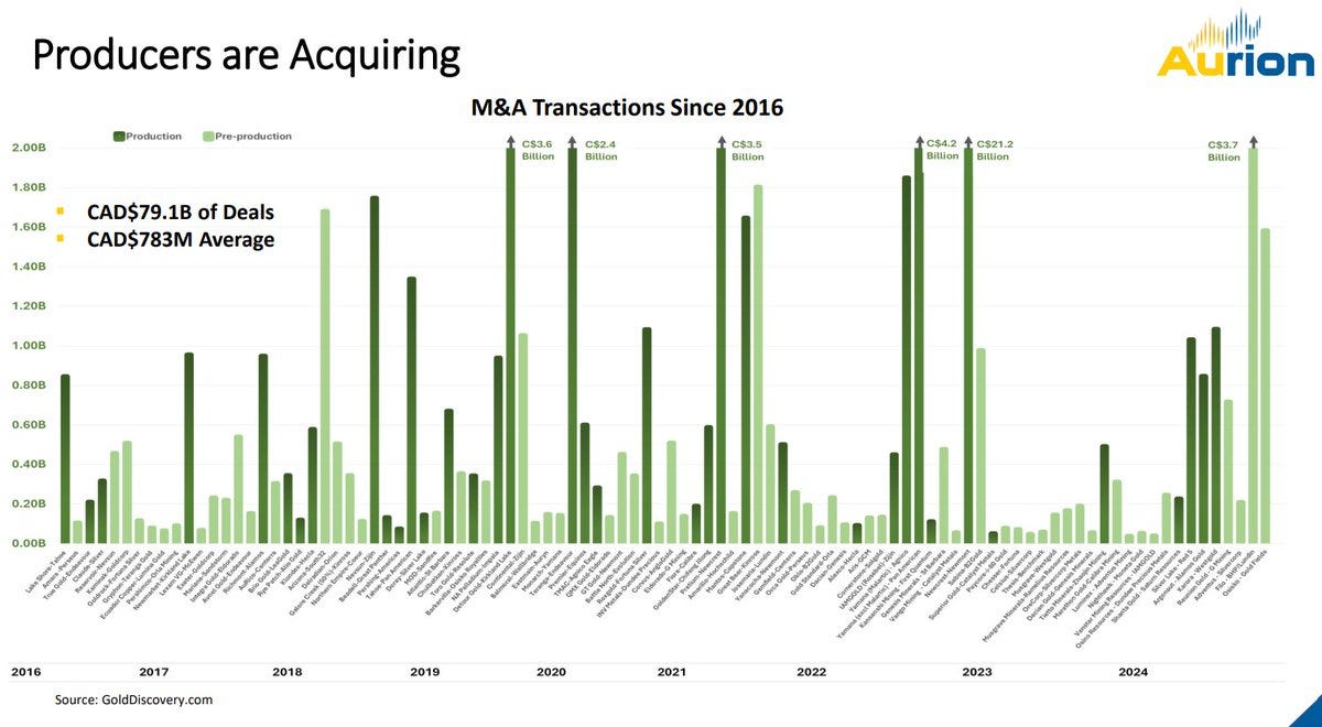 Robert Sinn shares that: “gold mining M&A is picking up again with a slew of pre-production acquisitions in the last 12 months.“ (source)