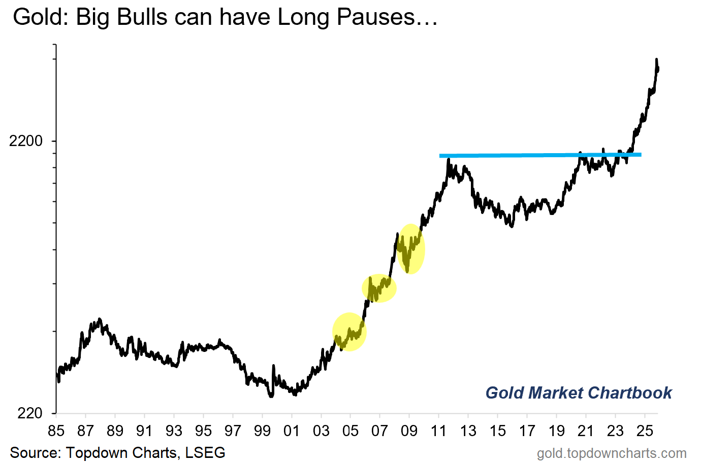 The 2000’s big bull featured several long periods of consolidation, and multiple smaller consolidations — in fact a key feature of gold bull markets seems to be that much of the upward movement happened basically across a series of weeks (and in some cases a few key days).