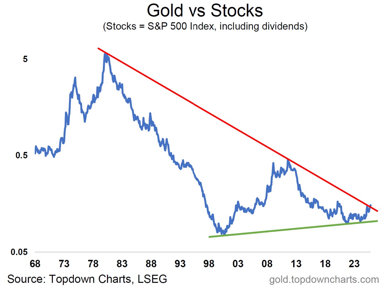 Speaking of lines, it seems like the gold/stock ratio is in the process of breaking out of its multi-decade triangle pattern. (source)
