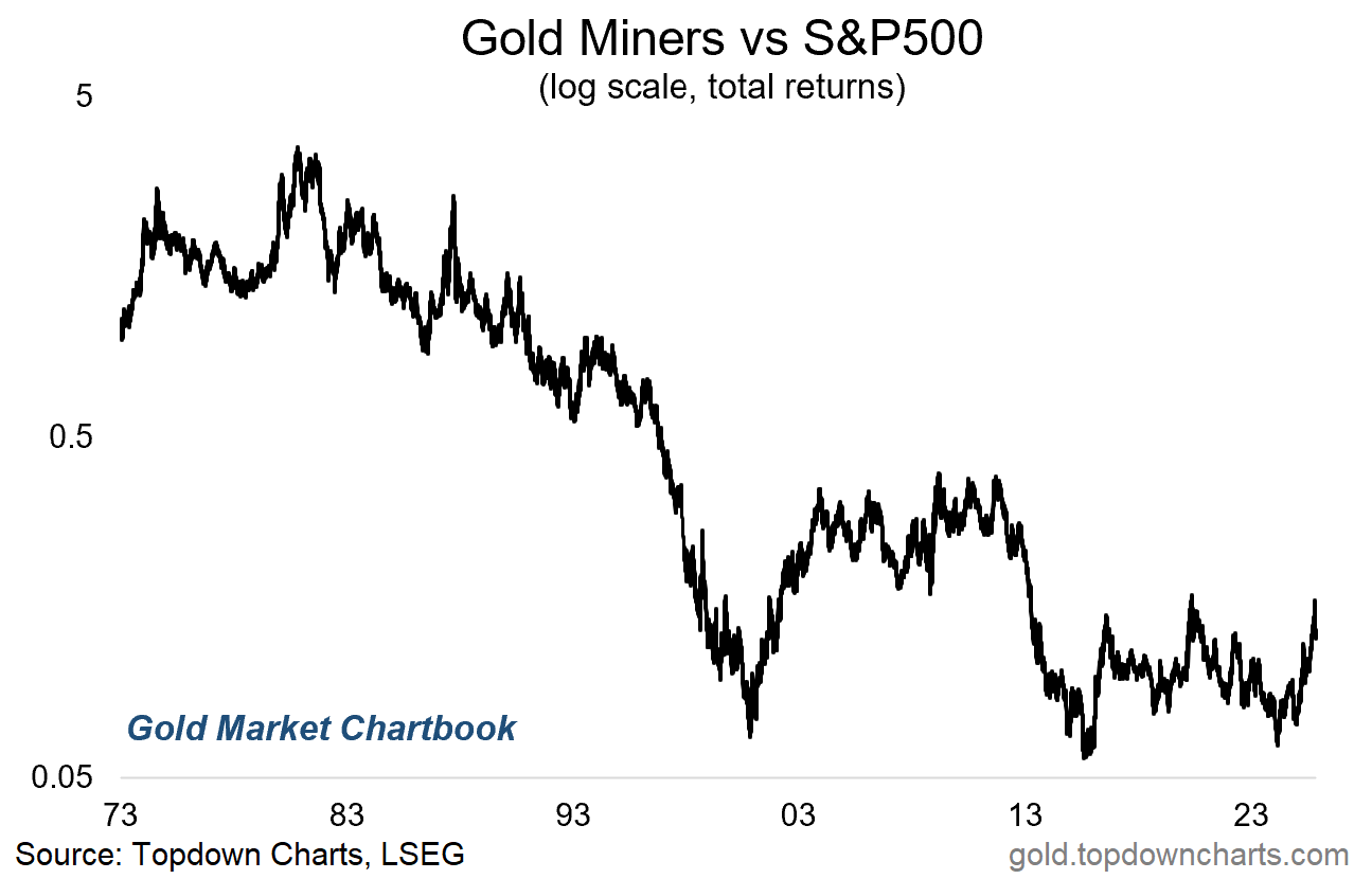 For completeness, here’s another relative returns chart but for gold miners (both in total return terms, i.e. dividends included) — you see a similar stalemate in miners vs stocks over the past decade.