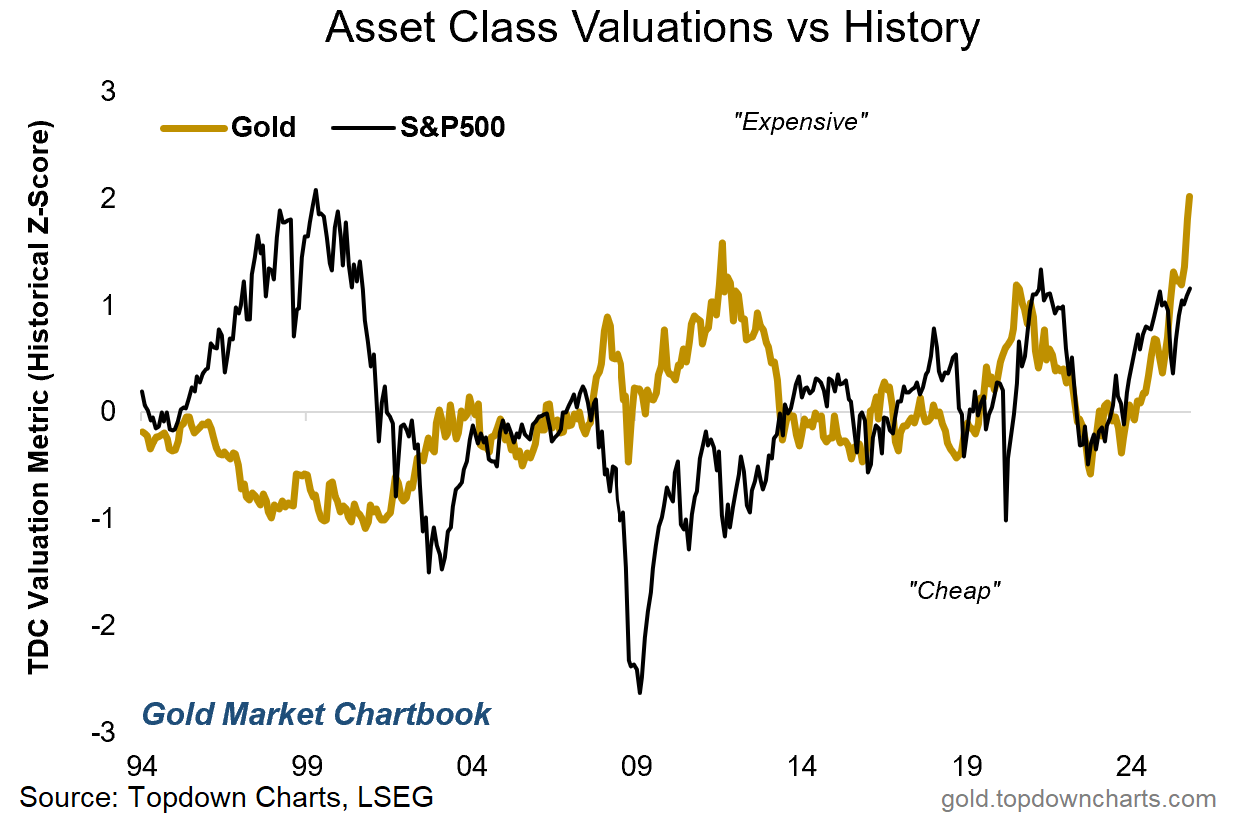 Lastly, the interesting thing about the gold vs stocks calculus is that while probably everyone knows about how stocks are expensive… gold isn’t exactly cheap either.