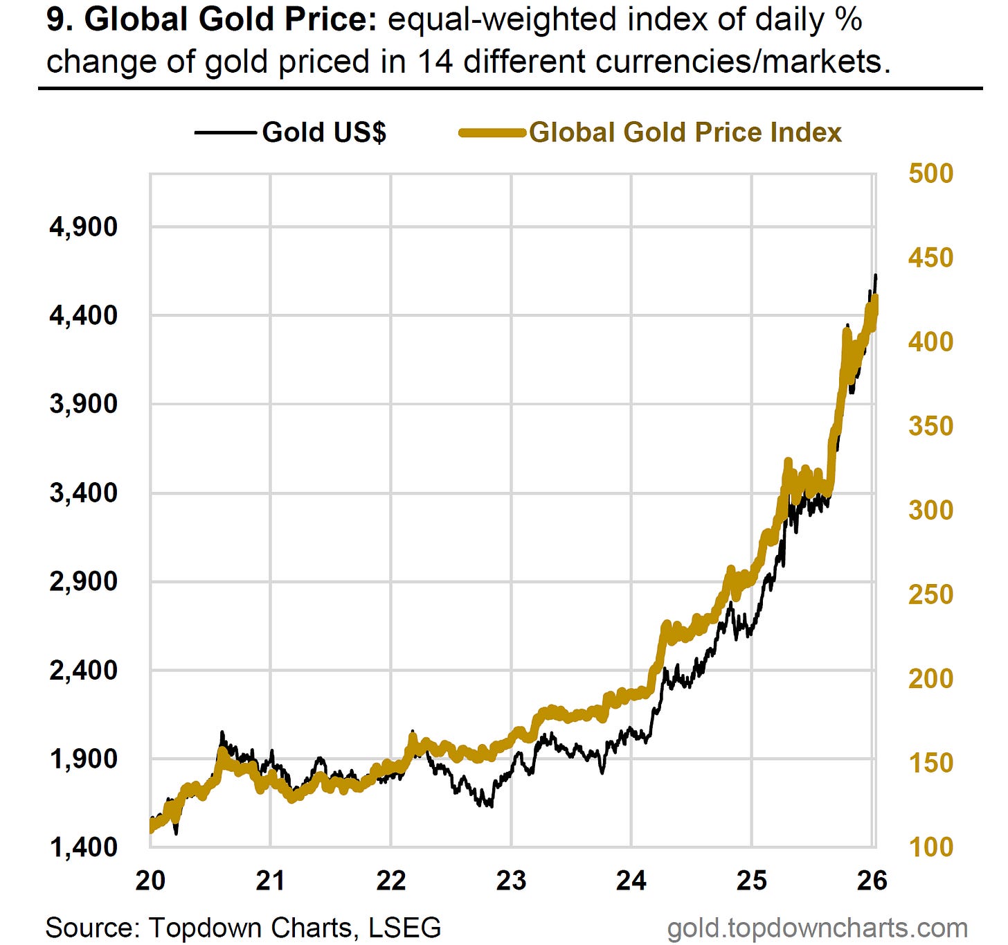 In that respect, it’s a good sign to see the US$ gold price breaking out to new highs, and the Global Gold Price Index likewise headed onward and upward.