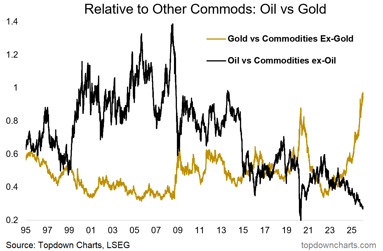 Which does bring me back to this one — gold is looking very stretched vs the rest of commodities (and on the flipside, crude oil is very stretched, but in the opposite direction). (source)