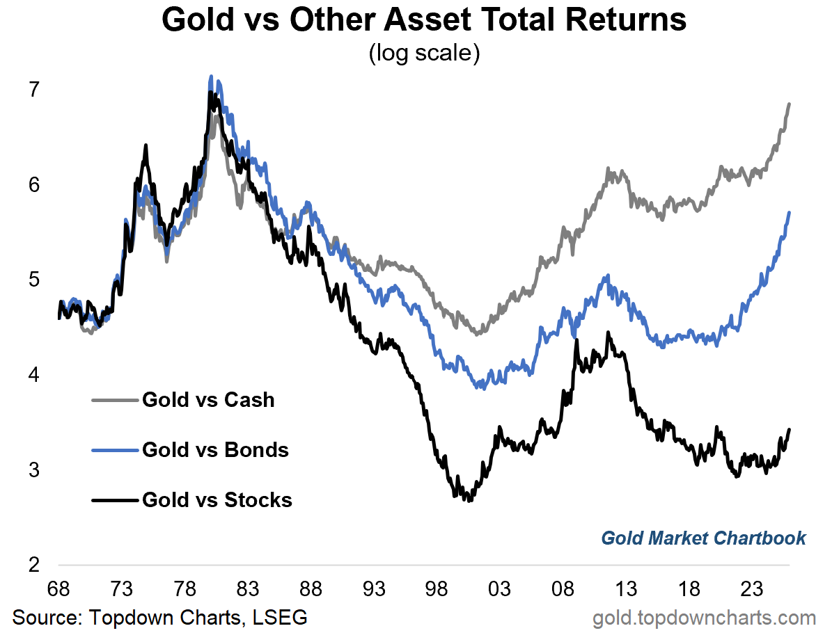 I first featured this chart back in February, suggesting room for catch-up by the black line (gold vs stocks relative performance). And gold sure did outperform vs stocks this year (gold up +66% vs stocks up +17%) — but perhaps the bigger open question is will the black line catch-up even further? (and what will that mean for how the world looks if that happens…)