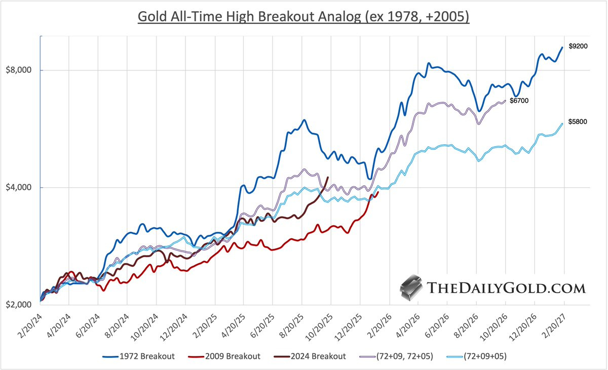 “Gold All-Time High Breakout Analog Gold has followed the two averages closely. From around here, both averages corrected for 5 months, then surged higher. [this implies] Weaker = $5800 in 16 months, Stronger = $6700 in 10 months.” (source)