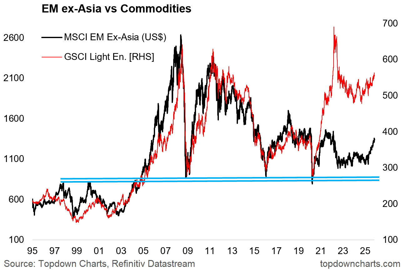 And then set that alongside the bullish bottoming process on display in commodities (using the relatively diversified GSCI light energy index here), and it’s both confirmation of the previous chart and themes + further prompt to consider the bullish picture emerging in these still kind of out-of-fashion markets (everyone is focused on US big tech and missing what’s happening here).