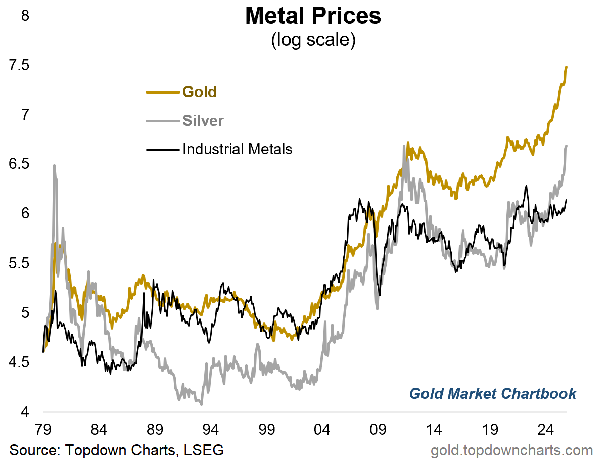 The gold to silver to base metals procession you're tracking is probably the cleanest roadmap for where capital flows next in this cycle. That industrial metals breakout alongside your global growth reacceleration call for 2026 sets up a pretty compelling case for copper and alum plays. The valuation extreme warning is noted but with central banks still buying and most retail allocations still under 2% this feels like mid cycle territory not a top.