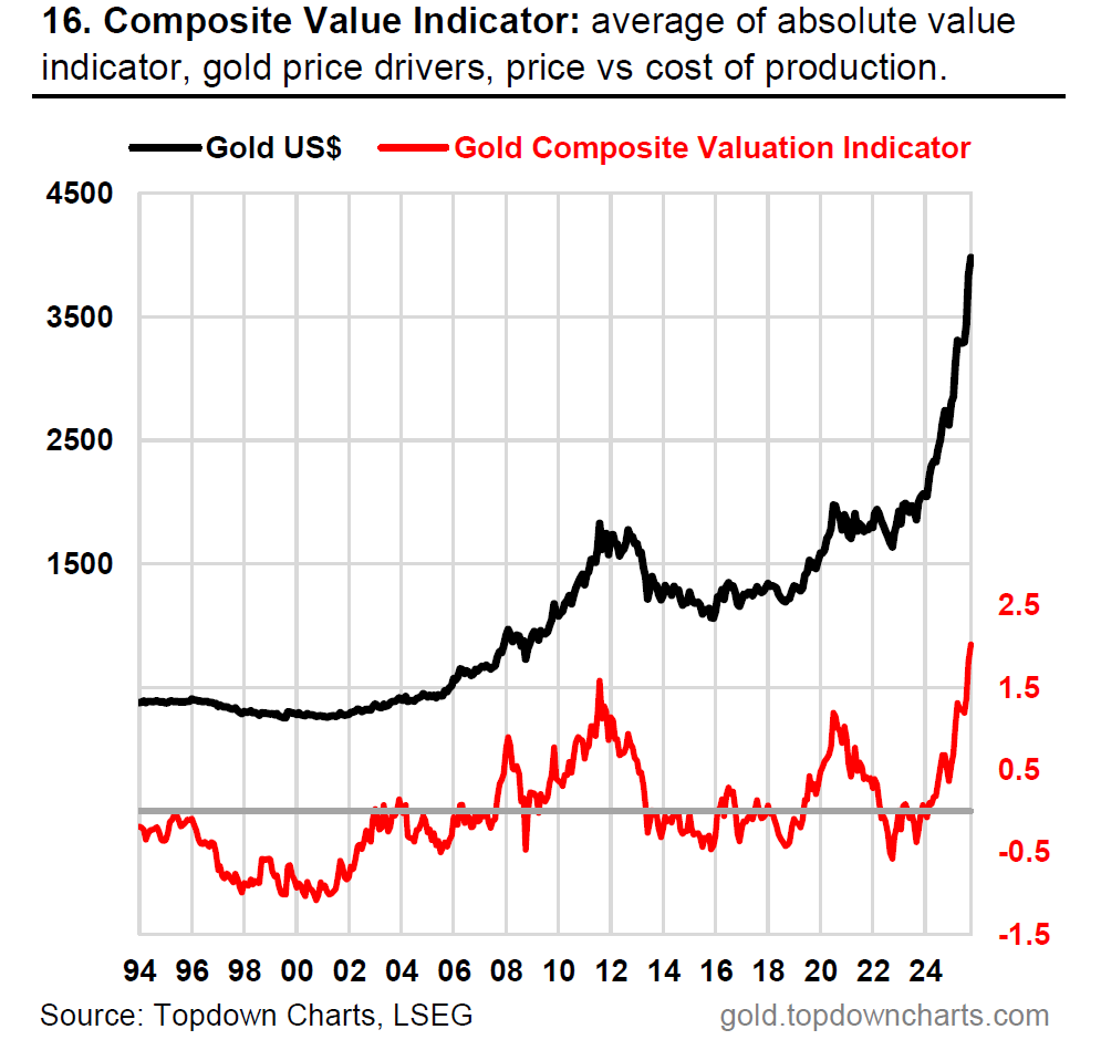 While the trend is still strong and up, investor allocations still have room to rise, and monetary tailwinds are still significantly supportive, the composite gold valuation indicator is in extreme expensive territory. (source)